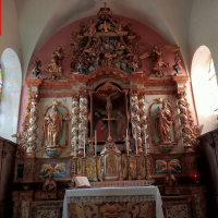 Un maître-autel juste splendide, avec des fines dorures, des statues d’anges, de Saint-Pierre et de Saint-Paul qui sont les Saints Patrons de la paroisse, une fresque de Jésus-Christ et enfin des vases avec de fausses fleurs !