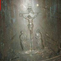 Cette cloche est la plus décorée de l’ensemble, avec l’effigie de Saint-François-Xavier, la Vierge Marie, le Christ en Croix, et beaucoup de très belles frises de fleurs, de feuilles, et de belles formes.