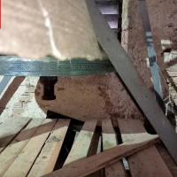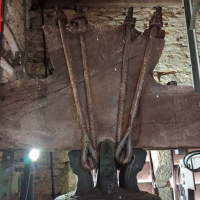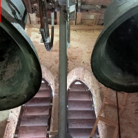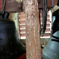 Nous devons monter deux petites échelles de meunier pour atteindre deux paliers différents, peu conséquents, pour arriver devant une énorme échelle de meunier, très large, pour arriver 40 ou 50cm en dessous des cloches. Il nous faut poser le genou sur la base du beffroi métallique pour nous retrouver juste devant la petite cloche.